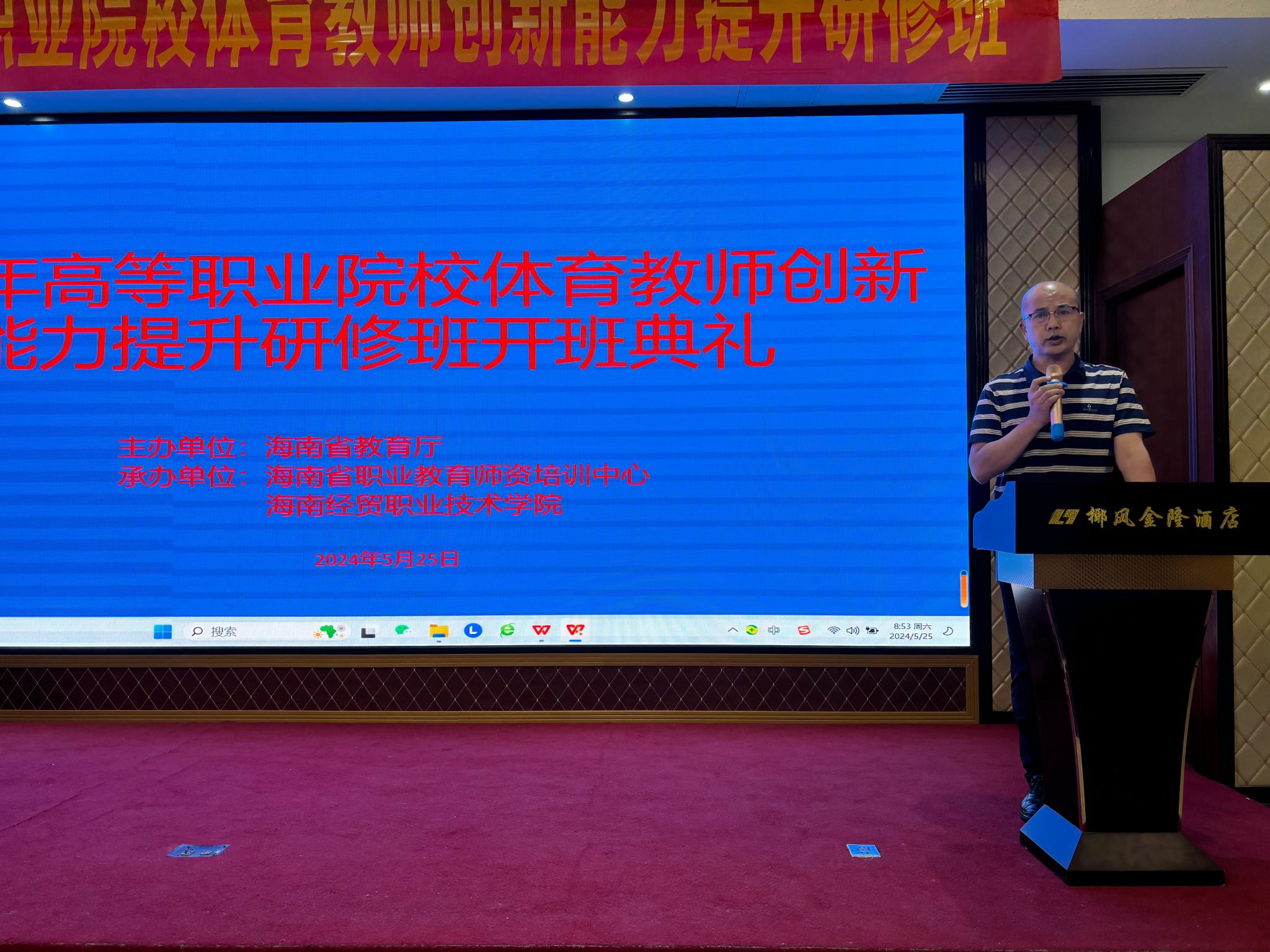 2024年5月25日至26日,由海南省教育厅主办,海南经贸职业技术学院、海南省职业教育师资培训中心承办的2024年全省高等职业院校体育教师创新能力提升研修班在琼海市举办,顺利完成全部培训计划,圆满结束。来自全省14所高职院校共80名体育教师参加本次培训,海南经贸职业技术学院英国正版365官方网站院长胡友波主持培训会,海南经贸职业技术学院英国正版365官方网站党总支书记曹迪伟出席培训会。