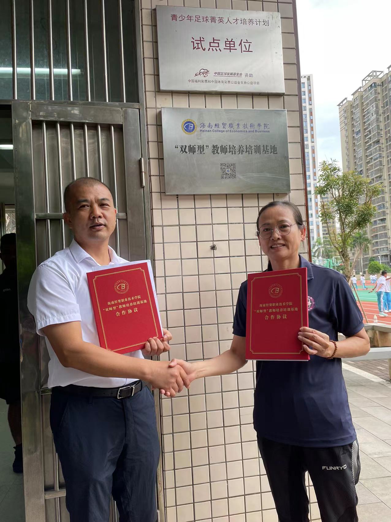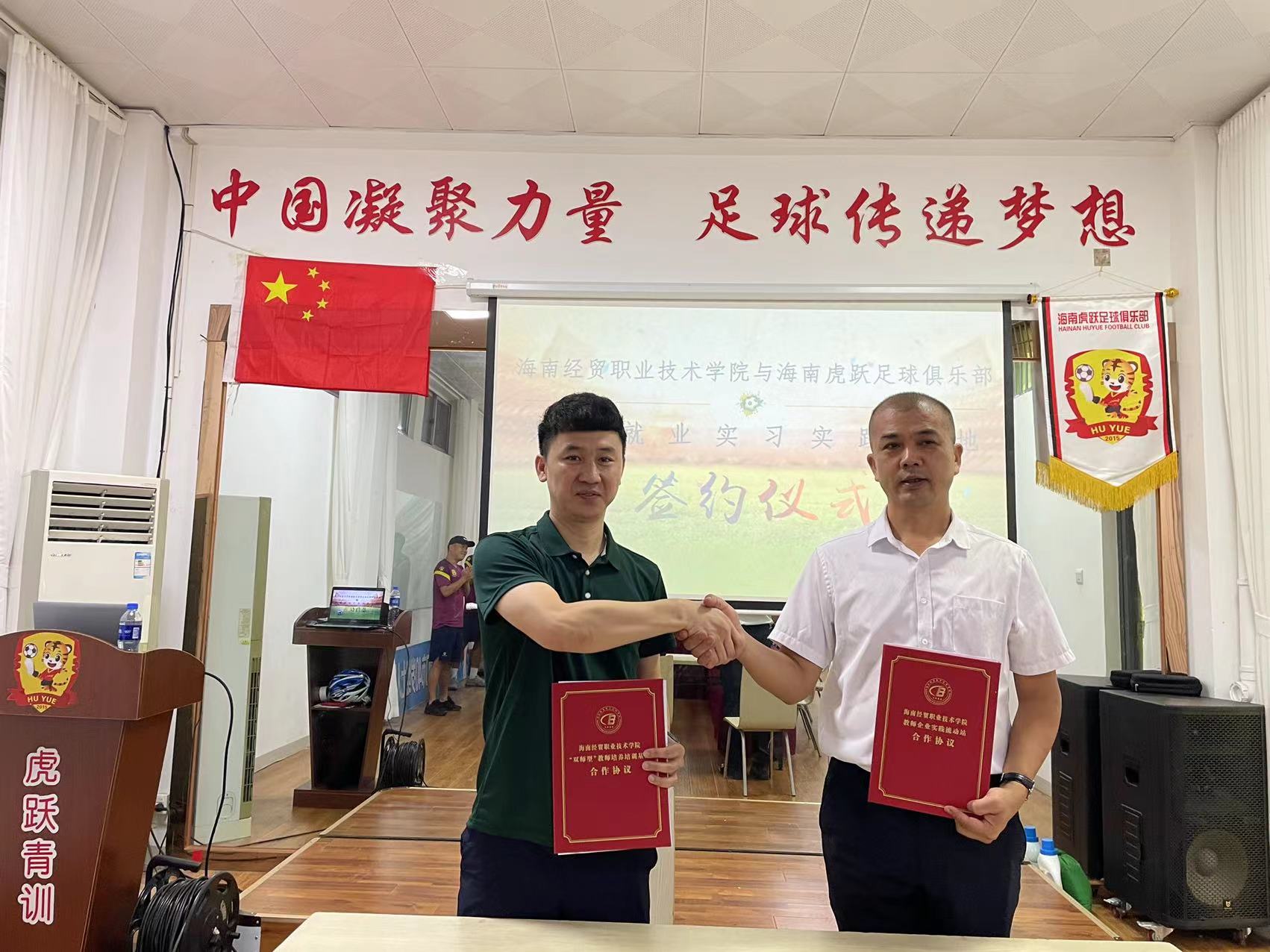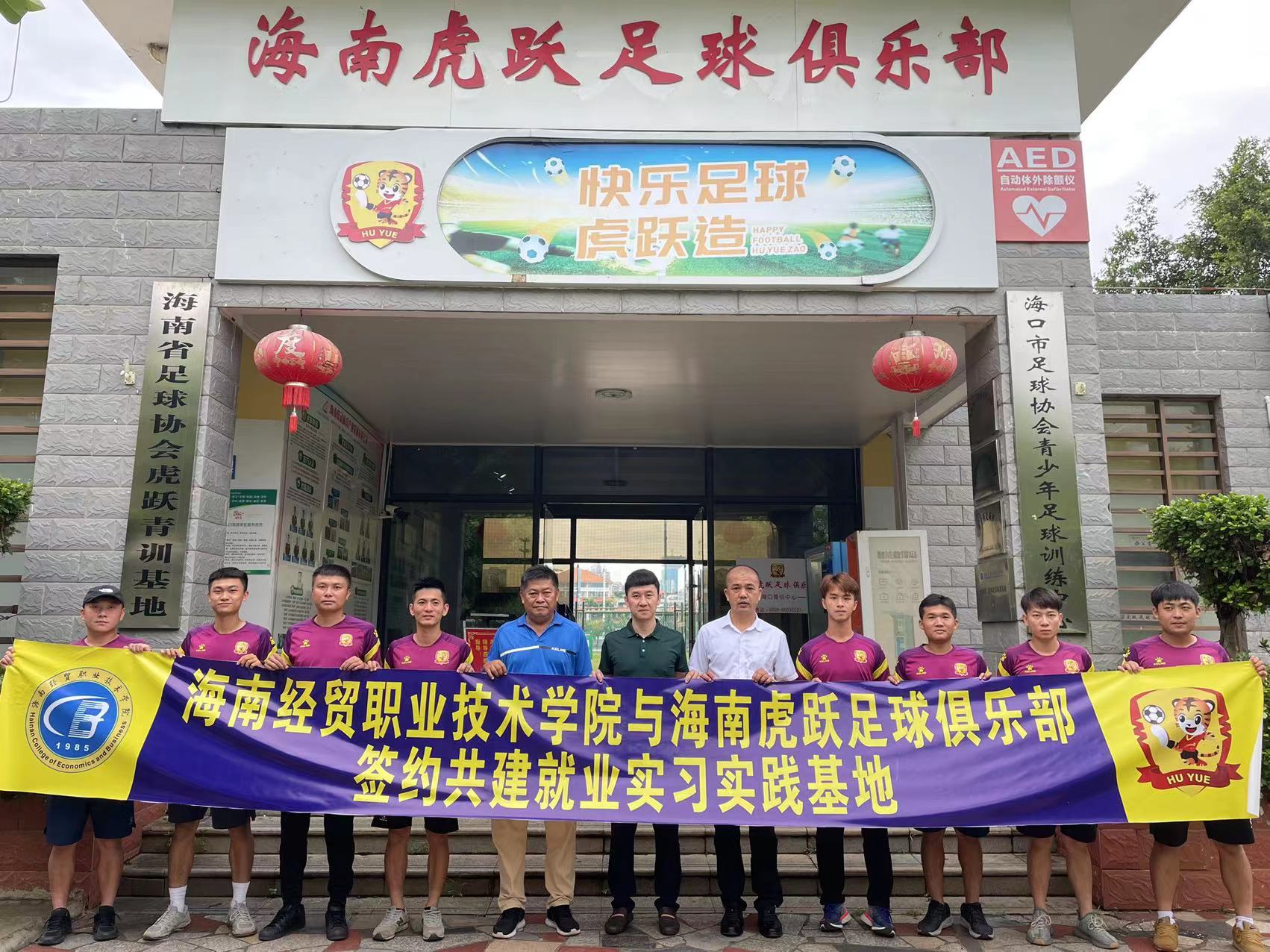 为贯彻落实《海南经贸职业技术学院教师企业实践基地建设三年行动计划(2021-2023)》和“访企拓岗”专项行动,进一步深化校企合作,落细落实教师企业实践基地建设和访企拓岗促就业工作,2022年6月8日,英国正版365官方网站分别与海南韦海英足球俱乐部、虎跃足球俱乐部签订合作协议并举行挂牌仪式,英国正版365官方网站院长胡友波、副院长黄闻寰出席。